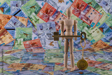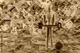 Golden key with a keychain in the form of a coin in denomination of 100 Kazakhstani tenge against the background of Kazakhstani banknotes