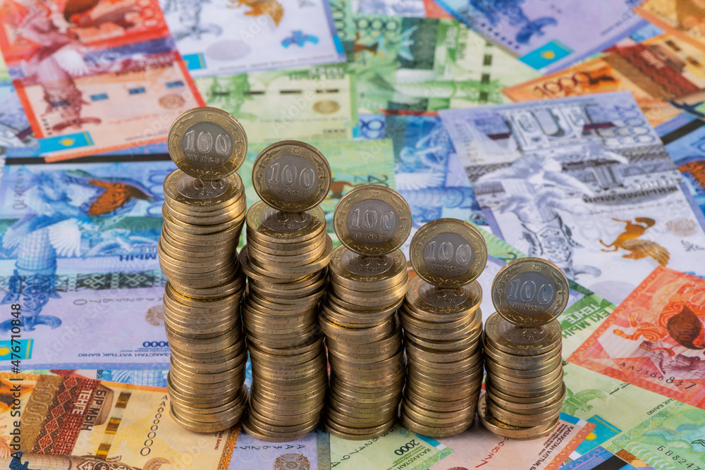 Columns of coins in denominations of 100 tenge against the background of Kazakhstani banknotes of different denominations
