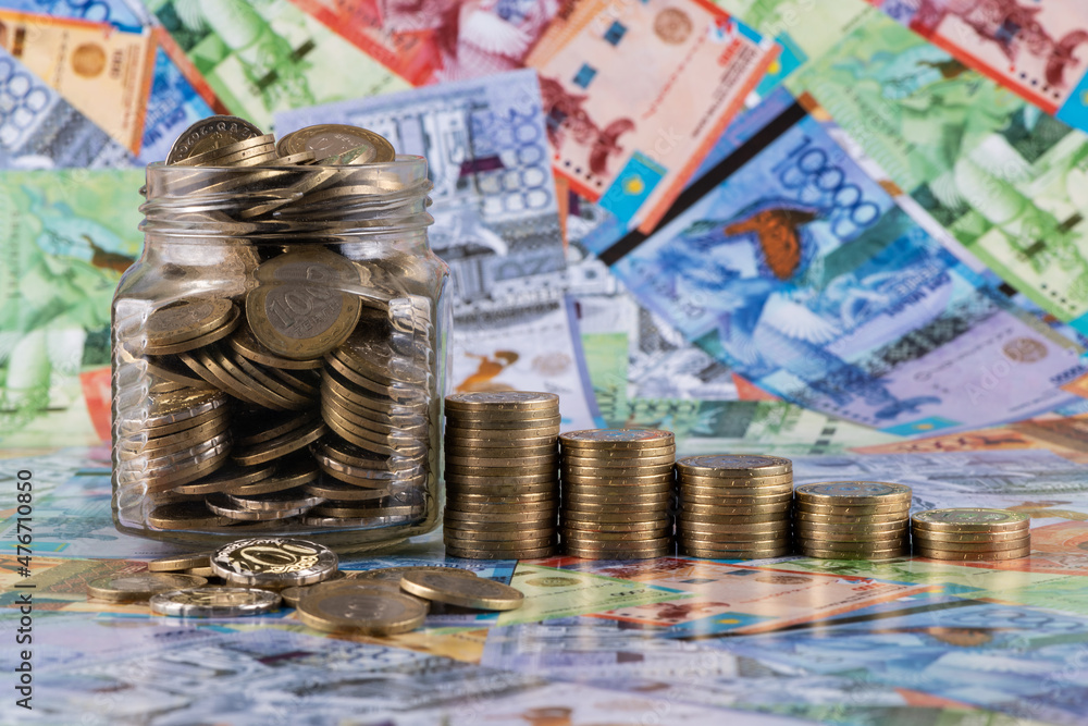 Columns of coins in denominations of 100 tenge and a glass jar against the background of Kazakhstani banknotes of different denominations