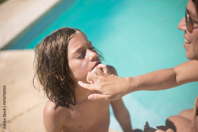 Kind mother and son near swimming pool at backyard. Mid adult woman in sunglasses applying sunscreen on schoolboys back and cheek. Leisure, family, party concept