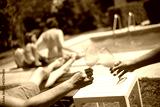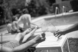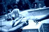 Close-up of glasses with orange juice. Man and woman on deck chairs holding glasses with fresh drink. Looking at children playing in background. Leisure, family, party concept