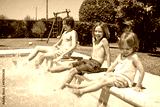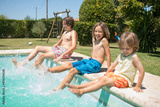 Happy brothers having fun near swimming pool. Boys of different ages splashing water with feet, smiling, laughing. Leisure, family, party concept