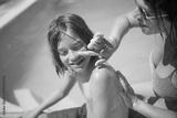 Loving mother and son near swimming pool at backyard. Mid adult woman in sunglasses applying sunscreen on schoolboys back and cheek. Leisure, family, party concept