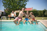 Portrait of happy brothers having fun near swimming pool. Boys of different ages splashing water with feet, smiling, laughing, showing thumbs up. Leisure, family, party concept