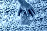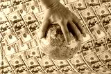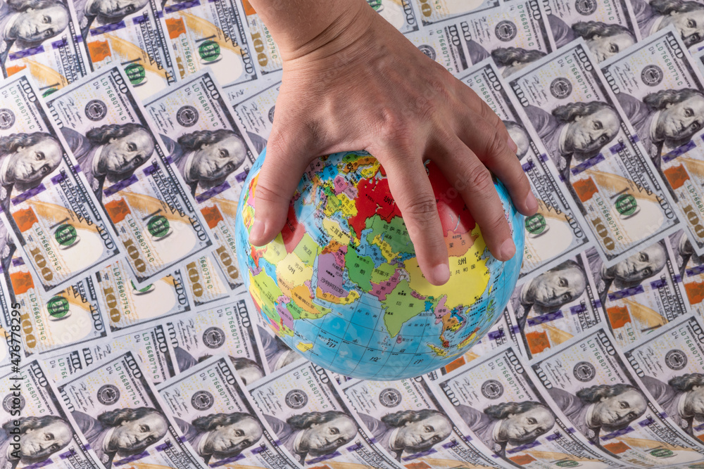 Children's rubber ball with a political world map in Chinese in a man's hand over American 100 dollar bills.