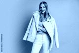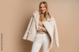 Pretty legant blond woman with red lips wearing trendy eco leather jacket , posing over beige background. Winter fashion trends.