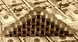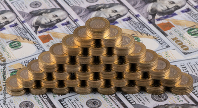 100 Kazakhstani tenge coins stacked in the form of a pyramid