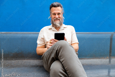 Mature caucasian man with beard sitting on metal bench using phone looking at camera.