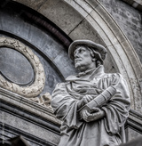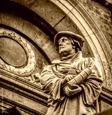 Monument of the reformer Martin Luther with a bible in his hand in front of Marble church in Copenhagen