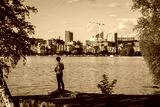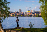 Man fishing at the Hatanpää arboretum, view of Tampere city over the lake Pyhäjärvi in Finland in the summer.