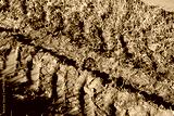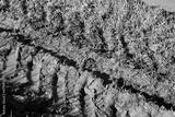 Dirt road after rain in the field. Puddles in a rut on the green grass. Slush on broken rural road with deep tire tracks