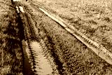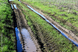 Dirt road after rain in the field. Puddles in a rut on green grass