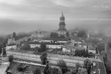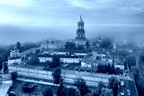 Aerial view of the Kiev-Pechersk Lavra at dawn, covered with thick fog. Kiev, Ukraine