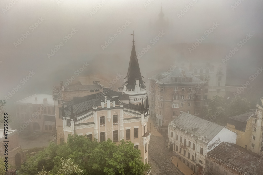 Fragment of the castle Richard the Lionheart 1904 - sights of the city of Kiev, Ukraine. The house is located, on Andreevsky Descent and is made in the English neo-Gothic style. Aerial view