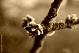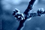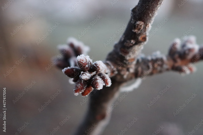 Frost on Cherry tree with little brown buds on branches on winter season. Prunus avium tree