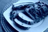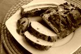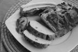 Baked and sliced bread with bacon on a plate on wooden table