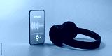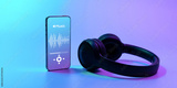 Music background. Mobile smartphone screen with music application, sound headphones. Audio voice with radio beats on neon gradient. Recording studio or podcasting banner with copy space.
