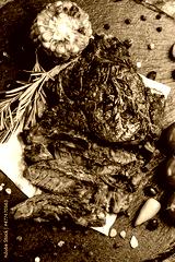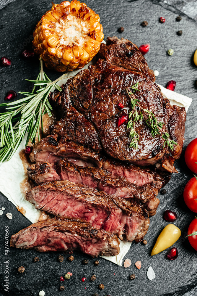 Juicy steak medium rare beef with spices. Grilled ribeye beef steak, vertical image. top view. place for text
