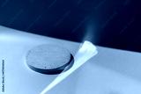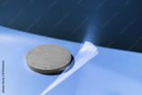 Concrete round podium in sun light with shadow on blue background. A scene with cement display show case for cosmetic beauty brands products mock up. Minimalistic abstract shopping sales concept