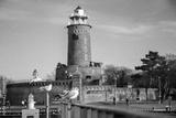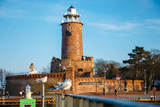 Seagull in the harbor and the lighthouse in Kolobrzeg,