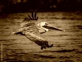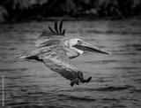 Close up of the American Brown pelican as it flies into the Venice Jetty