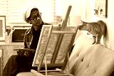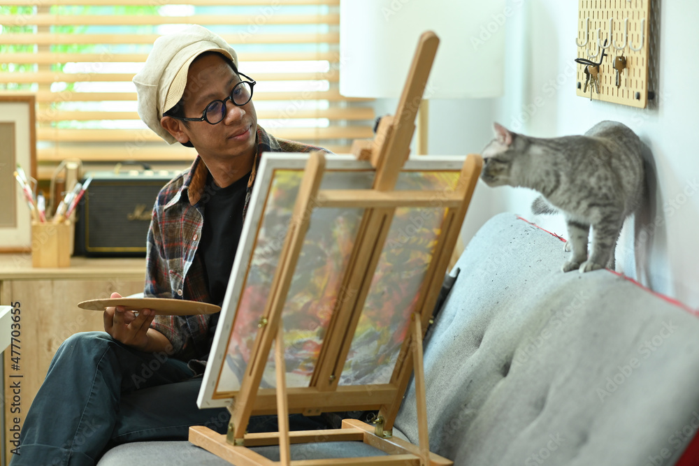 Photo of young talented male artist painting picture on canvas at the comfortable art studio.