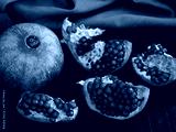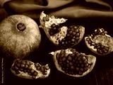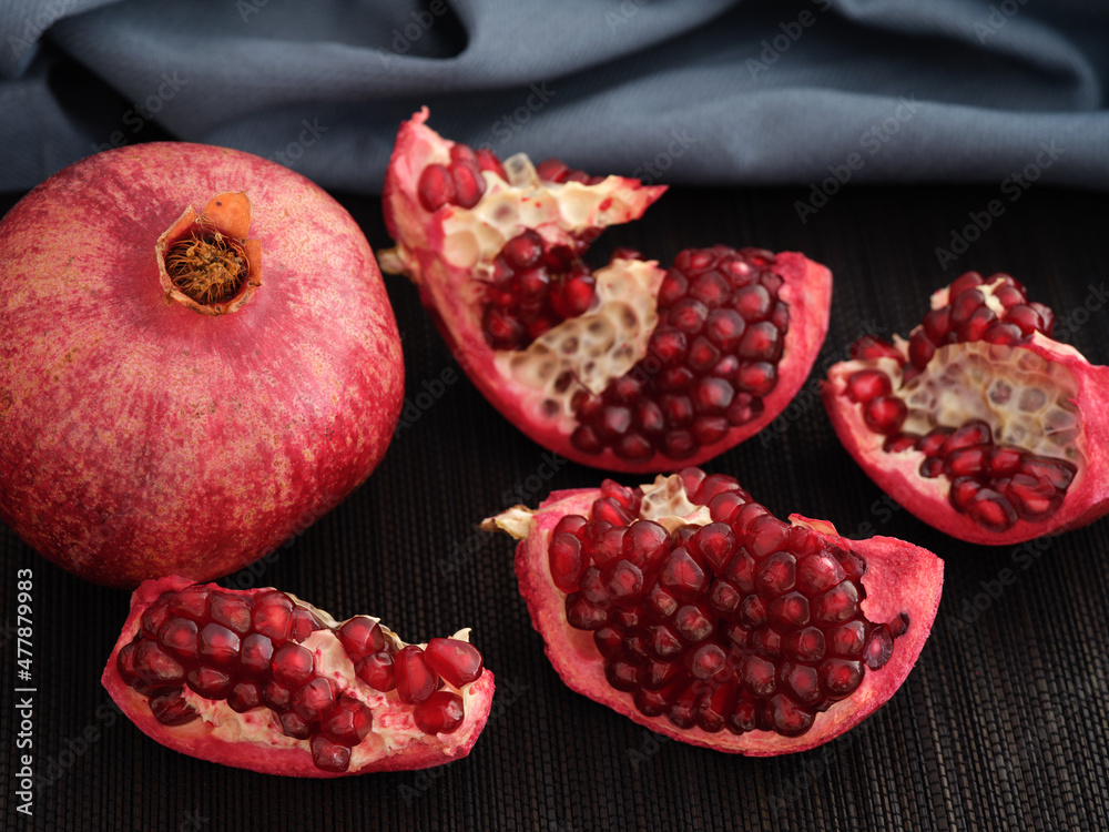 Fresh organic pomegranate slices. Low key. Close up.