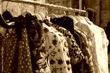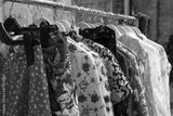 Second hand clothes on hangers for donation and reselling. Garage sale or economic shopping concept. Second life for your clothing. Selective focus