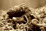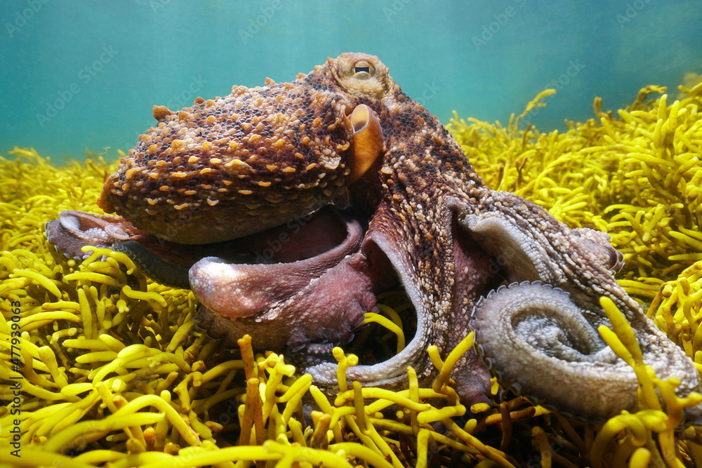 Octopus vulgaris mollusc underwater in the ocean with alga Bifurcaria bifurcata, Eastern Atlantic, Spain, Galicia