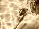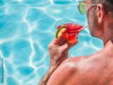 Beautiful glass with a refresh cocktail and an attractive man on the background of the swim pool. Top view, close-up. Vacation and travel concept. Moments of celebration