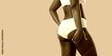 Plus size black model posing in underwear. Brown skinned woman wearing comfy natural cotton panties holding hands on bottocks standing on beige color background. Female body concept, rear back view