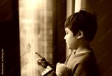 Portrait of school boy standing next to window and using his finger drawing or writing on window glass, Side view of child hand drawing on glass, Toddler boy looking at him self through window.