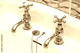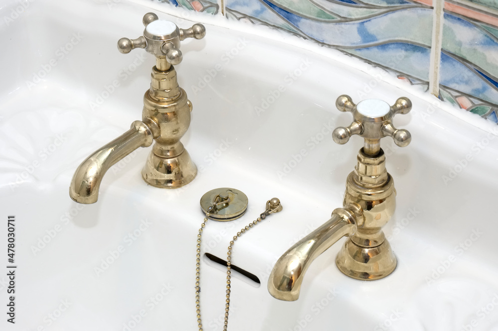 New luxury hotel vintage brass gold plated pillar taps in ensuite bathroom at wash basin