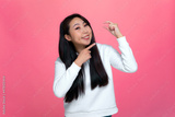 Happy asian young girl showing with fingers small price little size gesture on pink background. Sale, big discounts