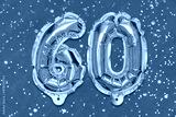 The number of the balloon made of golden foil, the number sixty on a red background with sequins. Birthday greeting card with inscription 60. Anniversary concept. Numerical digit, Celebration event.
