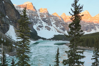 Beautiful morning at sunrise at Moraine Lake. Wonderful road trip through Banff and Jasper national park in British Columbia, Canada. An amazing day in Vancouver. What a beautiful nature in Canada.