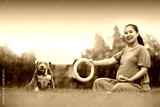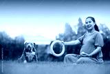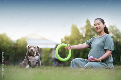 Dog mom Happy pregnant playing at grass , Puppy dog cut and funny , American bully dog , puppy dog