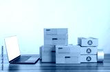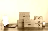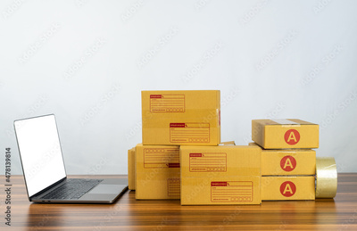 The box for sending to customers is on the table and there is a computer to receive online store orders, selling online businesses that are becoming popular nowadays, convenient shop online services