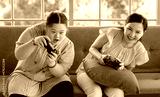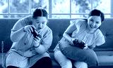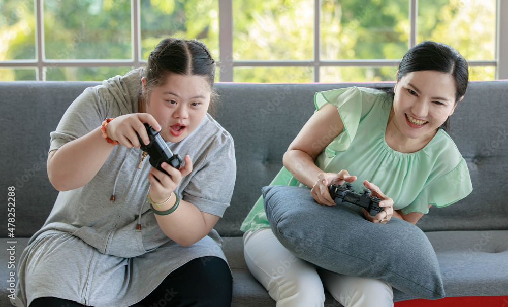 Asian happy funny lovely mother and young chubby down syndrome autistic autism little cute daughter sitting on cozy sofa smiling holding joysticks playing video game together in living room at home