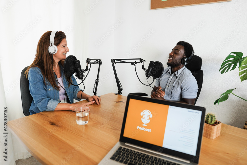 Hosts having podcast session together - Multiracial speakers making an interview during live stream - Focus on female face
