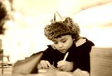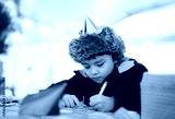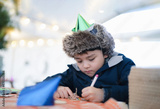 Cute boy with party hat using pink pen drawing or writing on paper colour with blurry bright light background, Kid having fun at birthday party, Child doing activity on Christmas or New Year holiday