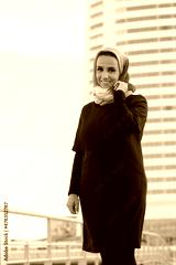 Elegant smiling Arabic woman during walk. Woman with covered head and make up looking at camera. International, beautiful concept