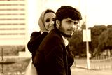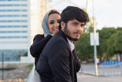 Warm Arabic couple spending time together. Woman with covered head and bright make-up and man in suit sitting on bench. Love, affection concept