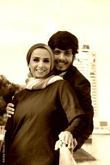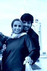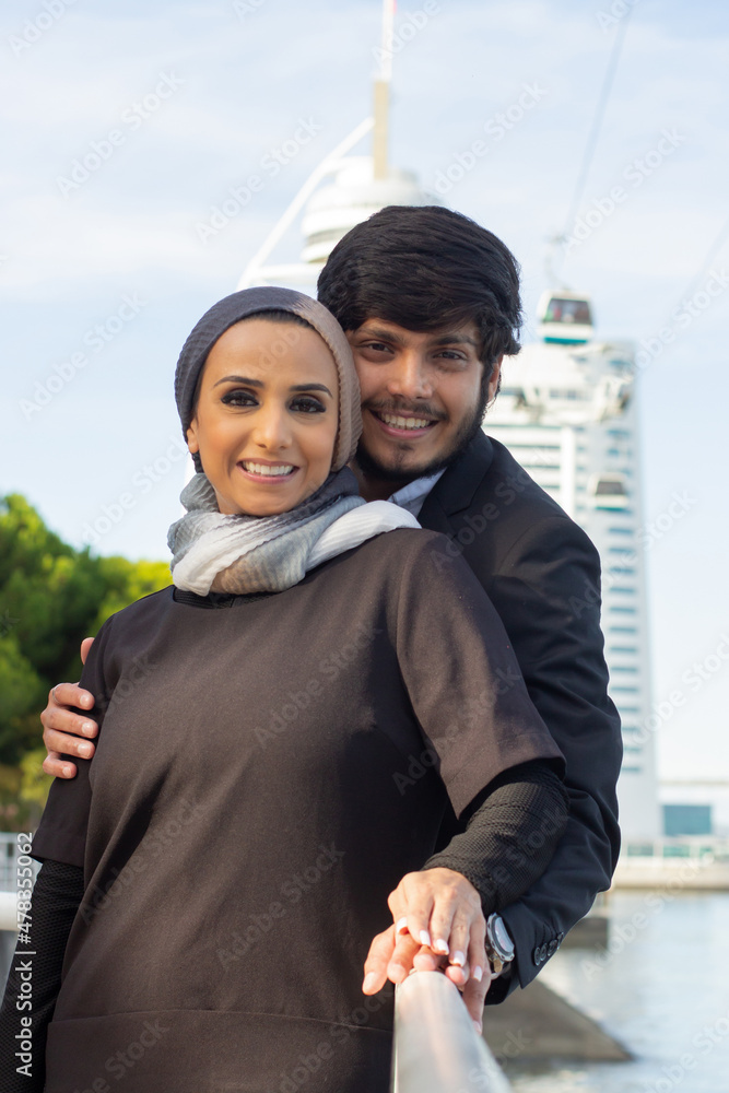 Portrait of caring Arabic couple. Woman with covered head and bright make-up and man in suit smiling at camera, hugging. Love, affection concept