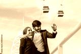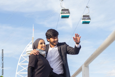 Affectionate Arabic couple walking together. Woman with covered head and bright make-up hugging boyfriend, man showing something. Love, affection concept