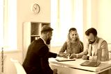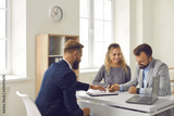 Happy young family signs lease or purchase agreement given to them by bank manager or real estate agent. Male realtor or financial advisor in office at meeting shows clients place to sign contract.