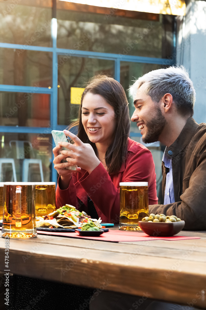 Friends looking at mobile phone in a bar enjoying beer and appetisers. Vertical image.