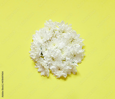 White chrysanthemum flowers circle frame on the yellow background.