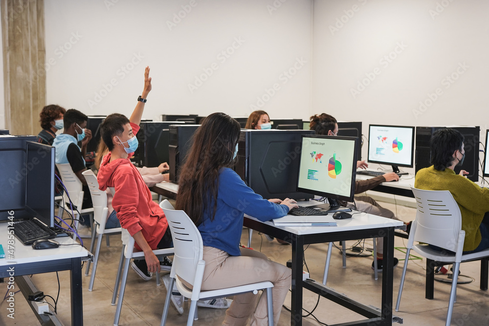 Young multiracial students using computer while wearing safety face mask for coronavirus outbreak