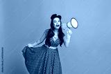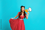 Big sale, promo, discount, breaking news. Young pinup woman in retro dress shouting into megaphone on blue background